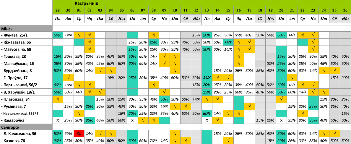 √ - Новае паступленне, 14/Х - Крама працуе да 14.00/Сан. дзень, 16/Х - Крама працуе да 16.00/Сан. дзень, 18/Х - Крама працуе да 18.00/Сан. дзень, : ) - Выхадны дзень, Х - Сан. Дзень/Крама не працуе; ■ - Зніжка пенсіянерам 20%